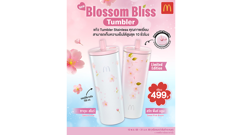 สายคิวท์ห้ามพลาด! แก้วคอลเลคชั่น ‘Blossom Bliss Tumbler’ รุ่นลิมิเต็ด สามารถซื้อสะสม หรือเป็นไอเดียของขวัญในช่วงเทศกาลปีใหม่ได้ ในราคาเริ่มต้นเพียงแก้วละ 499 บาท ตั้งแต่วันนี้ – 31 มกราคม 2569 (หรือจนกว่าสินค้าจะหมด) ที่ร้านแมคโดนัลด์ทุกสาขาที่ร่วมรายการ, บริการแมคไดร์ฟ ทรู และแมคดิลิเวอรี โทร.1711, เว็บไซต์ www.mcdonalds.co.th หรือ รายละเอียดเพิ่มเติมที่ Facebook.com/McThai