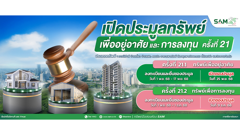 ทั้งนี้ ผู้สนใจเข้าร่วมประมูลสามารถลงทะเบียนและยื่นซองประมูล พร้อมเอกสารประกอบการประมูลที่กำหนด โดยทรัพย์เพื่อที่อยู่อาศัยและเพื่อการลงทุน ราคาไม่เกิน 20 ลบ. (ครั้งที่ 21.1/2568) ภายในวันที่ 17 พ.ย. 2568 และกำหนดเปิดซองประมูลวันที่ 25 พ.ย. 2568 ส่วนทรัพย์ที่มีราคาสูงกว่า 20 ลบ. (ครั้งที่ 21.2/2568) ภายในวันที่ 1 ธ.ค. 2568 และกำหนดเปิดซองประมูลวันที่ 9 ธ.ค. 2568 เวลา 10.00 น. เป็นต้นไป ที่สำนักงานใหญ่ SAM อาคารซันทาวเวอร์ส ถ.วิภาวดีรังสิต กรุงเทพฯ หรือสอบถามรายละเอียดเพิ่มเติมได้ที่ Call Center 1443 และดูรายละเอียดทรัพย์สินได้ทางเว็บไซต์ที่ www.sam.or.th รวมทั้งช่องทางออนไลน์ที่หลากหลายและสะดวกรวดเร็ว โดยแอด ID Line @Samline ติดตาม Facebook /YouTube / TikTok ได้ที่ “SAM บริหารสินทรัพย์สุขุมวิท” เพื่อติดตามข้อมูลข่าวสารดี ๆ จาก SAM