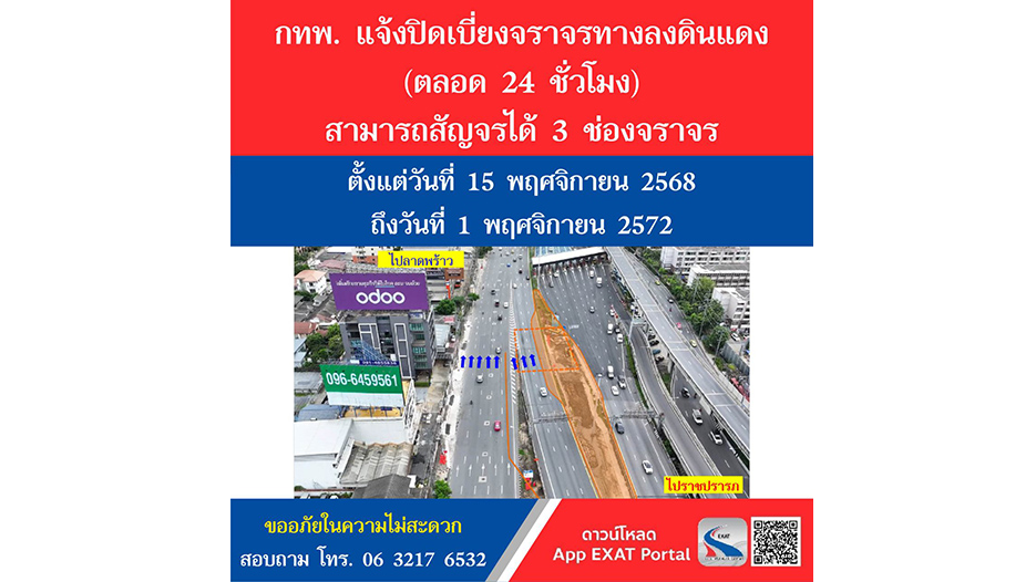 การทางพิเศษฯ แจ้งปิดเบี่ยงทางลงดินแดง บนทางพิเศษเฉลิมมหานคร ตลอด 24 ชั่วโมง พร้อมเปิดให้สัญจรได้ 3 ช่องทาง ระหว่างก่อสร้างปล่องระบายอากาศโครงการรถไฟฟ้าสายสีส้ม ช่วงบางขุนนนท์–มีนบุรี ขอให้ผู้ใช้ทางวางแผนการเดินทางล่วงหน้า