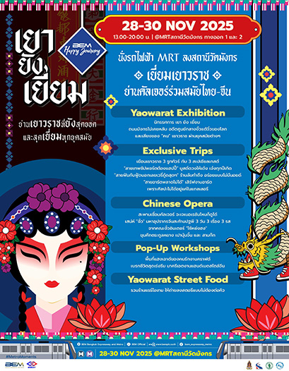 ช่วงปลายเดือนนี้ 2568 BEM และ รฟม. ชวนทุกคนนั่งรถไฟฟ้า MRT มาเยี่ยมเยียนย่านคัลเจอร์ร่วมสมัยไทย-จีนด้วยกิจกรรม BEM Happy Journey 2025 “เยา ยัง เยี่ยม” ที่อัดแน่นไปด้วยกิจกรรมสุดพิเศษให้สายเที่ยว สายชิล และสายครีเอทีฟได้เพลิดเพลินกันแบบไม่มีพัก ไม่ว่าจะเป็น “Exclusive Trips เยือนเยาวราช” 3 เส้นทางที่จะเปิดมุมมองใหม่ของเยาวราชกับ 3 วิทยากรพิเศษ การแสดงมหาอุปรากรจีนสะท้านปฐพี “งิ้ว” จากคณะไซ้หย่งฮง สร้างความตื่นตาตื่นใจจัดเต็ม 3 วัน 3 เรื่อง Pop-Up Workshops พื้นที่แฮงเอาต์ของคนรักงานคราฟต์ กลิ่นอายสไตล์จีน และที่สำคัญมาถึงถิ่นเยาวราชทั้งที ของอร่อยต้องไม่พลาด! ภายในงานรวบรวมร้านเด็ดร้านดังของเยาวราชมาไว้ครบจบในที่เดียว พิเศษสำหรับผู้ที่ลงทะเบียนเข้าร่วมงานจะได้รับหนังสือพิมพ์ฉบับพิเศษที่มีพาสปอร์ตแสตมป์ นำไปสะสมตราประทับ ครบ 5 ดวง หลังจากช้อป-ชิมที่สตรีทฟู๊ดกว่า 20 ร้านตลอดถนนแปลงนาม และบางส่วนภายในศูนย์การ I’m Chinatown แล้วนำมาแลกรับของที่ระลึกสุดพิเศษจาก BEM (มีจำนวนจำกัด)