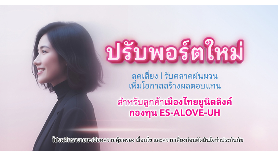 เมืองไทยประกันชีวิต ปรับพอร์ตแนะนำการลงทุนยูนิตลิงค์ส่งท้ายปี 2568 พร้อมเพิ่มกองทุนใหม่ ES-ALOVE-UH สร้างโอกาสรับผลตอบแทนช่วงตลาดผันผวน สามารถจัดพอร์ตกองทุนรวมได้หลากหลาย ตอบโจทย์ความต้องการของลูกค้าในทุกระดับความเสี่ยง และช่วยให้การวางแผนสร้างผลตอบแทนระยะยาวมีเสถียรภาพเพิ่มมากขึ้น
