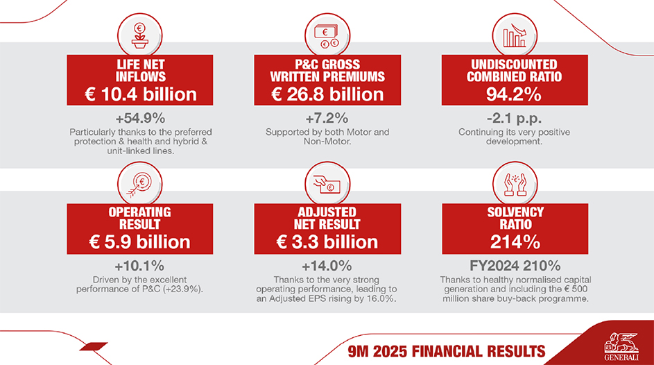 โดยในช่วง 9 เดือนของปี 2025 ผ่านมา เจนเนอราลี่ กรุ๊ป สามารถสร้างการเติบโตอย่างต่อเนื่องเมื่อเทียบกับช่วงเดียวกันของปีก่อน โดยมี เบี้ยประกันภัยรับรวม (Gross Written Premium) อยู่ที่ประมาณ 2.79 ล้านล้านบาท (73.1 พันล้านยูโร) เพิ่มขึ้น 3.7% ขณะที่ ธุรกิจประกันชีวิต (Life Net Inflow) มียอดเงินไหลเข้าสุทธิ อยู่ที่ประมาณ 3.96 แสนล้านบาท (10.4 พันล้านยูโร) ด้านธุรกิจบริหารสินทรัพย์และความมั่งคั่ง (Asset & Wealth Management) ที่ยังคงเติบโตในทิศทางบวก อยู่ที่ 32.16 พันล้านบาท (843 ล้านยูโร) เพิ่มขึ้น 0.7% ส่งผลให้ผลการดำเนินงาน (Operating Result) เพิ่มขึ้นอย่างมีนัยสำคัญเป็น 2.27 แสนล้านบาท  (5.9 พันล้านยูโร) เพิ่มขึ้น 10.1% จากผลการดำเนินงานที่แข็งแกร่งของธุรกิจประกันวินาศภัย (P&C) และการสนับสนุนในเชิงบวกจากทุกกลุ่มธุรกิจ