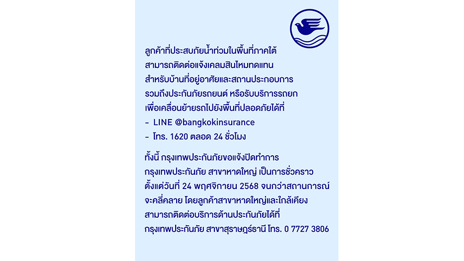 กรุงเทพประกันภัยแจ้งปิดทำการสาขาหาดใหญ่ชั่วคราวจนกว่าสถานการณ์จะคลี่คลาย พร้อมเป็นกำลังใจให้แก่ผู้ประสบภัยน้ำท่วมในภาคใต้