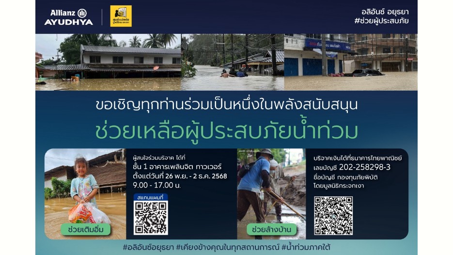 อลิอันซ์ อยุธยา เปิดรับบริจาคสิ่งของที่จำ เพื่อช่วยเหลืออุทกภัยภาคใต้