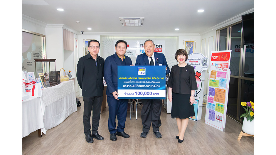 คุณสมพร มูลศรีแก้ว ผู้จัดการใหญ่ สายธุรกิจ คุณวุฒิพงศ์ บุญยะสิทธิ์ ผู้ช่วยประธานเจ้าหน้าที่บริหาร สายพัฒนาสินทรัพย์ภูมิภาค 2 บริษัทบริหารสินทรัพย์ กรุงเทพพาณิชย์ จำกัด (มหาชน) หรือ BAM มอบเงินสมทบโครงการปันน้ำใจช่วยเหลือผู้ประสบอุทกภัยในพื้นที่ภาคใต้ ให้กับสภากาชาดไทย จำนวน 100,000 บาท โดยมีคุณขรรค์ ประจวบเหมาะ ผู้อำนวยการสำนักงานจัดหารายได้ และคุณจันทร์ประภา วิชิตชลชัย รองผู้อำนวยการสำนักงานจัดหารายได้ เป็นผู้แทนรับมอบ ณ สำนักงานจัดหารายได้ สภากาชาดไทย