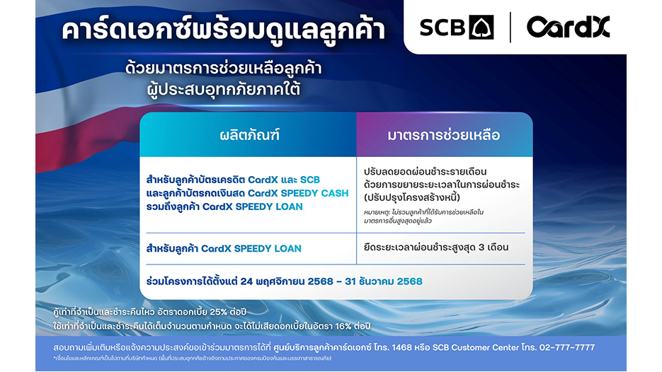 โดยลูกค้าสามารถติดต่อสอบถามหรือขอเข้าร่วมมาตรการช่วยเหลือได้ที่ ศูนย์บริการลูกค้าคาร์ดเอกซ์ โทร. 1468 หรือ SCB Customer Center โทร. 02-777-7777ตั้งแต่วันที่ 24 พฤศจิกายน 2568 – 31 ธันวาคม 2568