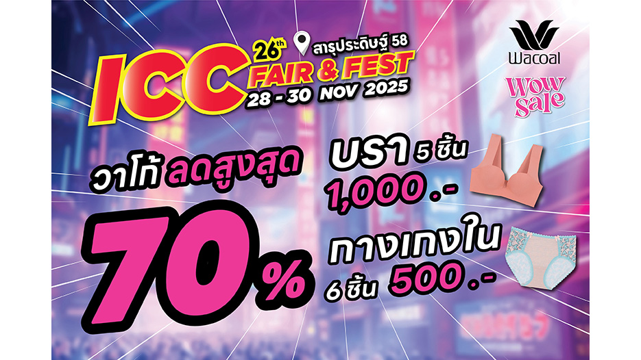 ส่งท้ายปีให้คุ้มที่สุด!! Wacoal Wow Sale ลดสูงสุด 70% ในงาน ICC Fair & Fest ครั้งที่ 26 เริ่ม 28-30 พฤศจิกายน 2568
