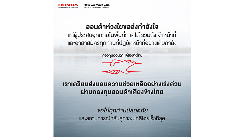 จากสถานการณ์อุทกภัยที่ทวีความรุนแรง และส่งผลกระทบต่อการดำเนินชีวิตของประชาชนในหลายพื้นที่ทางภาคใต้ ณ ขณะนี้ บริษัท ฮอนด้า ออโตโมบิล (ประเทศไทย) จำกัด ขอแสดงความห่วงใยต่อผู้ประสบอุทกภัย พร้อมส่งกำลังใจถึงเจ้าหน้าที่และอาสาสมัครทุกท่านที่ทุ่มเทแรงกายแรงใจในการช่วยเหลืออย่างเต็มกำลัง