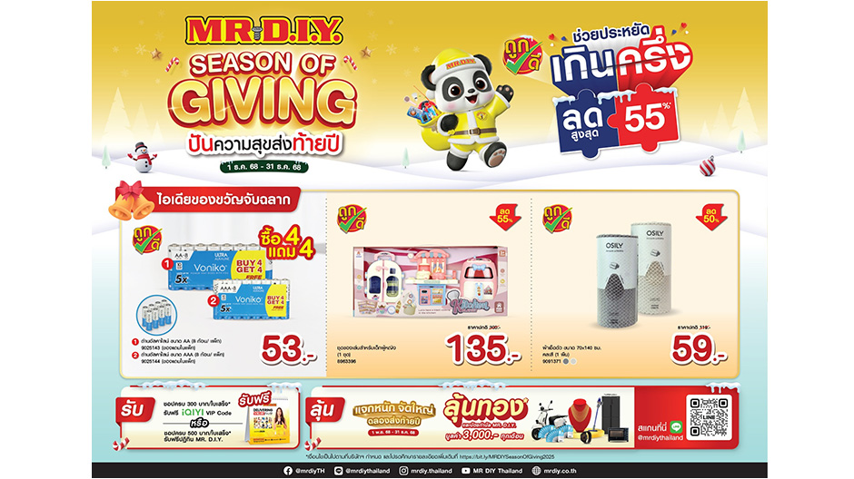 บริษัท มิสเตอร์. ดี.ไอ.วาย. โฮลดิ้ง (ประเทศไทย) จำกัด (มหาชน) ผู้นำธุรกิจค้าปลีกอุปกรณ์ตกแต่งบ้านและสินค้าไลฟ์สไตล์ทั่วไป ส่งแคมเปญ “Season of Giving ปันความสุขส่งท้ายปี”(1) ต้อนรับเทศกาลปลายปีอย่างยิ่งใหญ่ ด้วยสินค้า Gift Idea ลดสูงสุด 55% ผ่านการผสานกลยุทธ์การตลาด โปรโมชันสุดคุ้ม และกิจกรรมเพื่อสังคม (CSR) เพื่อมอบประสบการณ์ชอปปิงที่คุ้มค่าให้กับลูกค้าตลอดเดือนธันวาคม 2568 สะท้อนความมุ่งมั่นของบริษัทในการนำเสนอสินค้าราคาคุ้มค่าและตอบโจทย์ความต้องการของผู้บริโภคในช่วงเวลาส่งท้ายปี