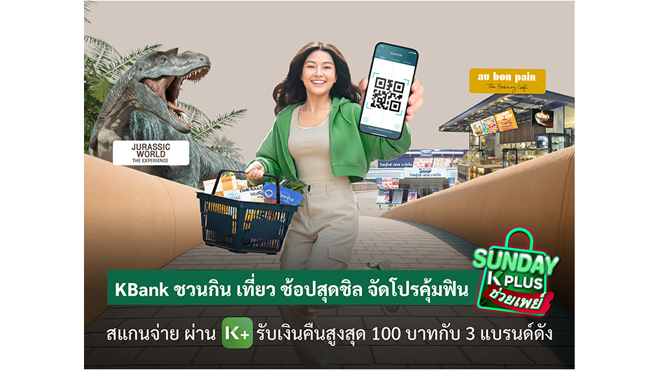 ธนาคารกสิกรไทยมอบความคุ้มสุดฟินให้ลูกค้าใช้ K PLUS กิน เที่ยว ช้อป สุดชิลทุกวันอาทิตย์ กับแคมเปญ “Sunday K PLUS ช่วยเพย์” สแกนจ่าย QR ผ่าน K PLUS ที่ 3 ร้านค้าแบรนด์ดัง Au Bon Pain  Jurassic World: The Experience  และ Thaifoods fresh market รับเงินคืนสูงสุด 100 บาท ตั้งแต่ วันนี้ – 11 มกราคม 2569