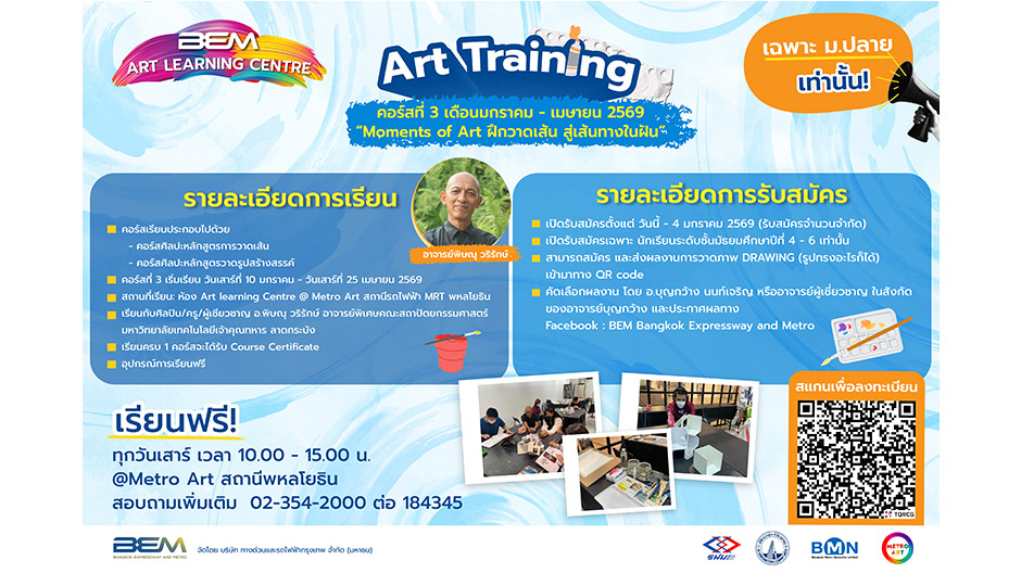 สำหรับ Art Training รุ่นที่ 3 นี้เริ่มเรียนตั้งแต่เดือนมกราคม – เดือนเมษายน 2569 เรียนเฉพาะ วันเสาร์ เวลา 10.00 – 15.00 น. ณ ห้อง Art Learning Centre Metro Art @MRT สถานีพหลโยธิน ผู้ที่สนใจสามารถส่งผลงานวาดภาพ (ไม่จำกัดรูปทรง) เพื่อคัดเลือกเข้าร่วมโครงการ ผ่านทาง QR Code หรือ https://shorturl.asia/v91Sn ตั้งแต่วันนี้ – 4 มกราคม 2569 (รับสมัครจำนวนจำกัด) และผู้ที่ผ่านการคัดเลือกจะได้รับการติดต่อกลับทางโทรศัพท์ ภายในวันที่ 7 มกราคม 2569 ติดตามรายละเอียดเพิ่มเติมได้ที่ Facebook (เฟซบุ๊ก) และ X (เอ็กซ์) : BEM Bangkok Expressway and Metro