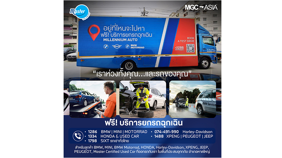 บริการรถยกฉุกเฉิน ‘ฟรี’ สำหรับลูกค้าเจ้าของรถยนต์ BMW, MINI, HONDA, XPENG, PEUGEOT, JEEP, BMW Motorrad และ Harley-Davidson ที่ได้รับผลกระทบจากสถานการณ์น้ำท่วมใหญ่ครั้งนี้ โดยมีทีมงานพร้อมประสานงาน และดำเนินการให้ความช่วยเหลือ เพื่อให้รถยนต์ของท่าน เข้าสู่การตรวจสอบและดูแล ภายในศูนย์บริการอย่างถูกต้องตามมาตรฐาน