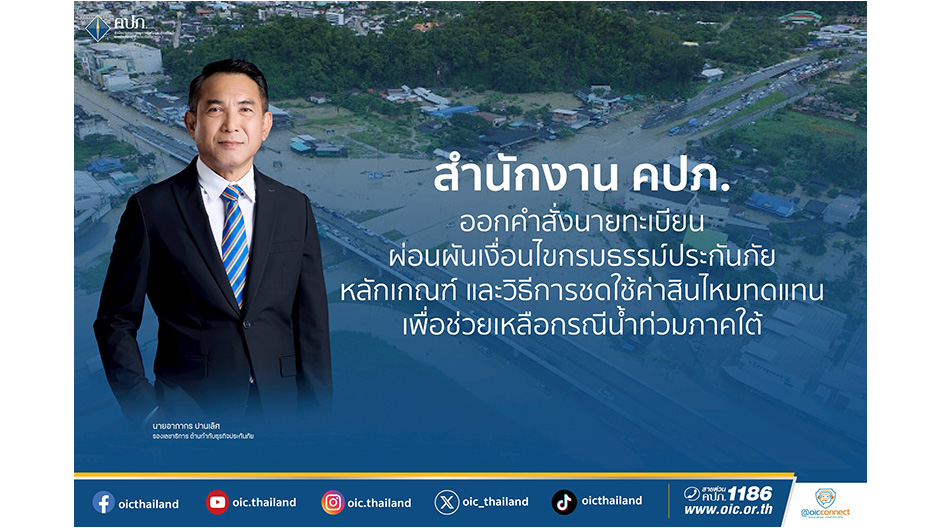 สำนักงาน คปภ. ออกคำสั่งนายทะเบียนผ่อนผันเงื่อนไขกรมธรรม์ประกันภัย หลักเกณฑ์ และวิธีการ ชดใช้ค่าสินไหมทดแทน เพื่อช่วยเหลือกรณีน้ำท่วมภาคใต้