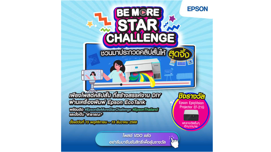 เอปสัน ประเทศไทย เชิญชวนนักเรียน นักศึกษา คอนเทนต์ครีเอเตอร์ และผู้ที่ชื่นชอบงาน DIY มาร่วมแสดงความ คิดสร้างสรรค์ในโครงการ “BE MORE – STAR CHALLENGE” การประกวดคลิปวิดีโอสั้นที่นำเสนอผลงาน DIY โดยใช้เครื่องพิมพ์ Epson EcoTank ในแบบที่เป็นตัวคุณ โครงการนี้มีเป้าหมายเพื่อเปิดพื้นที่ให้คนรุ่นใหม่ได้ทดลองไอเดียใหม่ ๆ สร้างสรรค์ผลงานที่ผสานเทคโนโลยีการพิมพ์เข้ากับงานประดิษฐ์หรือการใช้งานในชีวิตประจำวัน พร้อมส่งต่อแรงบันดาลใจสู่ผู้ชมในวงกว้างผ่านคลิปสั้นบนโซเชียลมีเดีย