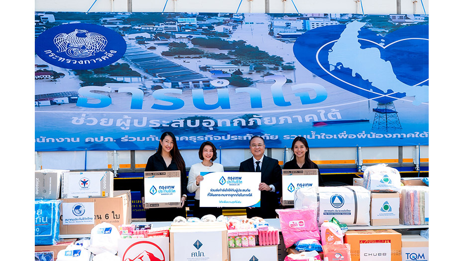บริษัท กรุงเทพประกันชีวิต จำกัด (มหาชน) โดยนางสาวอรนาฎ นชะพงษ์ ผู้ช่วยผู้จัดการใหญ่ สายกลยุทธ์การตลาดและบริหารจัดการลูกค้า ส่งต่อความใส่ใจ และร่วมเป็นส่วนหนึ่งในการบรรเทาความเดือดร้อนของประชาชนในพื้นที่ภาคใต้ที่ได้รับผลกระทบจากสถานการณ์อุทกภัย มอบชุดสิ่งของอุปโภคบริโภค เครื่องใช้จำเป็น และอุปกรณ์ทำความสะอาด เพื่อสนับสนุนการฟื้นฟูพื้นที่ประสบภัย ภายใต้โครงการ “ธารน้ำใจ ช่วยผู้ประสบอุทกภัยภาคใต้” ของศูนย์อำนวยการช่วยเหลือเครือข่ายวายุภักษ์ กระทรวงการคลัง โดยมีสำนักงานคณะกรรมการกำกับและส่งเสริมการประกอบธุรกิจประกันภัย (คปภ.) ทำหน้าที่ประสานความช่วยเหลือจากภาคธุรกิจประกันภัยทั่วประเทศ ในโอกาสนี้ นายชูฉัตร ประมูลผล เลขาธิการคณะกรรมการกำกับและส่งเสริมการประกอบธุรกิจประกันภัย (คปภ.) ให้เกียรติเป็นผู้รับมอบ ณ ลานอเนกประสงค์ สำนักงาน คปภ. เมื่อเร็วๆ นี้