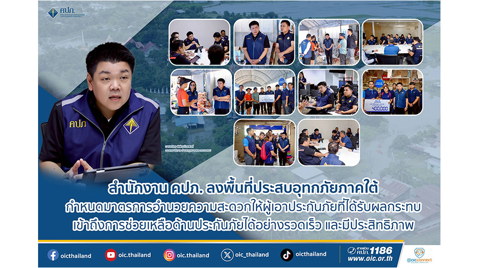 สำนักงาน คปภ. ลงพื้นที่ประสบอุทกภัยภาคใต้ กำหนดมาตรการอำนวยความสะดวกให้ผู้เอาประกันภัยที่ได้รับผลกระทบ เข้าถึงการช่วยเหลือด้านประกันภัยได้อย่างรวดเร็ว และมีประสิทธิภาพ