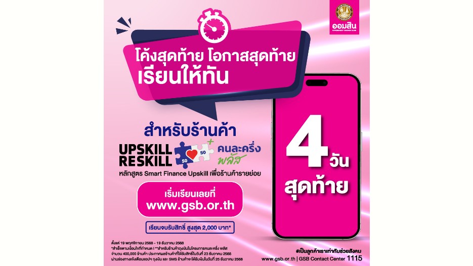ธนาคารออมสินกระตุ้นผู้ประกอบการร้านค้าบุคคลธรรมดา ที่เข้าร่วมโครงการ “คนละครึ่ง พลัส” และยังไม่ได้ลงทะเบียนเรียนหลักสูตร Smart Finance Upskill เร่งสมัครผ่านเว็บไซต์ www.gsb.or.th ตลอด 24 ชั่วโมง ก่อนหมดเขต 19 ธ.ค. 2568 เพื่อรับสิทธิ์พลัสสูงสุด 2,000 บาทต่อราย พร้อมยกระดับความรู้ทางการเงิน เสริมศักยภาพธุรกิจอย่างยั่งยืน