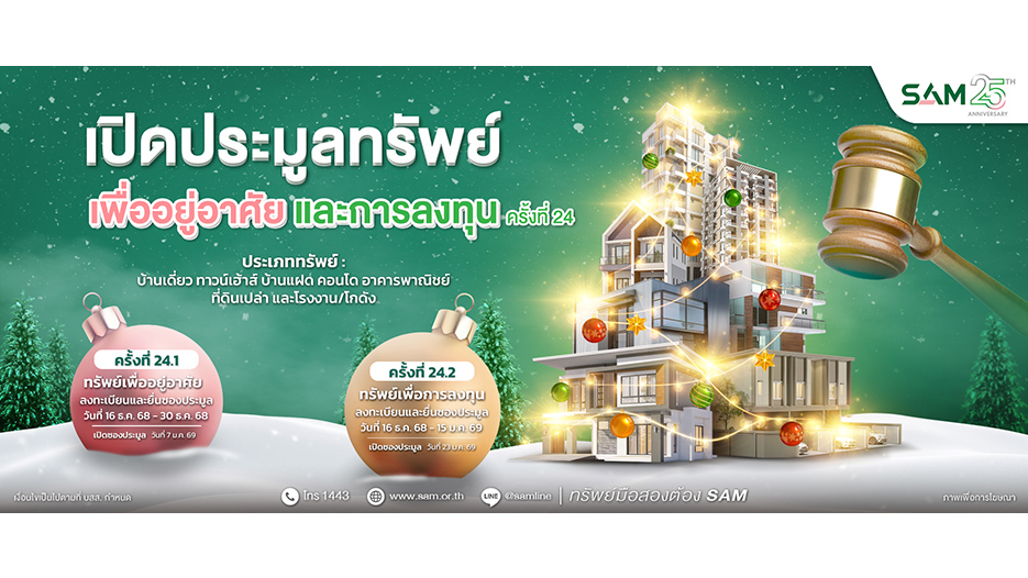 ทั้งนี้ ผู้สนใจเข้าร่วมประมูลสามารถลงทะเบียนและยื่นซองประมูล พร้อมเอกสารประกอบการประมูลที่กำหนด โดยทรัพย์เพื่อที่อยู่อาศัยและเพื่อการลงทุน ราคาไม่เกิน 20 ลบ. (ครั้งที่ 24.1/2568) ภายในวันที่ 30 ธ.ค. 2568 และกำหนดเปิดซองประมูลวันที่ 7 ม.ค. 2569 ส่วนทรัพย์ที่มีราคาสูงกว่า 20 ลบ. (ครั้งที่ 24.2/2568) ภายในวันที่ 15 ม.ค. 2569 และกำหนดเปิดซองประมูลวันที่ 23 ม.ค. 2569 เวลา 10.00 น. เป็นต้นไป ที่สำนักงานใหญ่ SAM อาคารซันทาวเวอร์ส ถ.วิภาวดีรังสิต กรุงเทพฯ  หรือสอบถามรายละเอียดเพิ่มเติมได้ที่ Call Center 1443  และดูรายละเอียดทรัพย์สินได้ทางเว็บไซต์ที่ www.sam.or.th  รวมทั้งช่องทางออนไลน์ที่หลากหลายและสะดวกรวดเร็ว โดยแอด ID Line @Samline ติดตาม Facebook /YouTube / TikTok ได้ที่  “SAM บริหารสินทรัพย์สุขุมวิท”  เพื่อติดตามข้อมูลข่าวสารดี ๆ จาก SAM