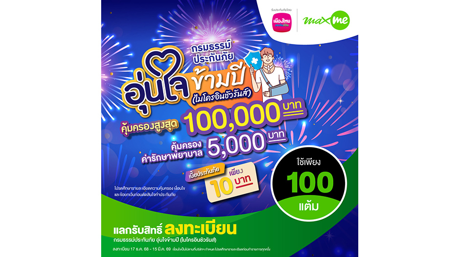 เมืองไทยประกันชีวิต ผนึกกำลัง แมกซ์ โซลูชัน เซอร์วิส บริษัทในเครือพีทีจี เพิ่มความอุ่นใจต้อนรับเทศกาลปีใหม่แก่สมาชิก Max Card ทั่วประเทศ ผ่านกรมธรรม์ประกันภัยอุ่นใจข้ามปี (ไมโครอินชัวรันส์)ประกันภัยอุบัติเหตุกลุ่มที่ให้ความคุ้มครองครอบคลุมทั้งด้านชีวิตและค่ารักษาพยาบาลเนื่องจากอุบัติเหตุ เพียงใช้แมกซ์พอยท์ 100 คะแนน แลกรับสิทธิ์ผ่านช่องทางแอปพลิเคชัน Max Me เริ่มตั้งแต่วันที่ 17 ธันวาคม 2568 – 15 มีนาคม 2569 (จำนวนสิทธิ์ 1,000 สิทธิ์)