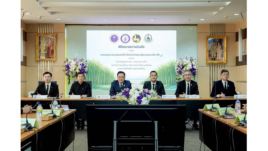 ยุคที่ 5.0 : เป็นการต่อยอดความสำเร็จในฤดูการผลิตปี 2568/2569 นี้ ซึ่งเป็นก้าวต่อไปของอุตสาหกรรมอ้อยและน้ำตาลทรายแบบที่เป็นมิตรกับสิ่งแวดล้อม กระทรวงอุตสาหกรรมได้มีแนวคิดผลักดันมาตรการจ่ายเงินช่วยเหลือตามประสิทธิภาพ และการใช้เทคโนโลยีภาพถ่ายดาวเทียม ตลอดจนการประยุกต์ใช้ข้อมูลด้านอุตุนิยมวิทยา จากแรงกดอากาศและทิศทางลม เพื่อควบคุมการเผาอ้อยได้อย่างมีประสิทธิภาพบนพื้นฐานของการควบคุมการเผาในเชิงพื้นที่ และการประยุกต์ใช้ข้อมูลด้านวิทยาศาสตร์และเทคโนโลยี และเทคโนโลยีดิจิทัล ดังนั้น กระทรวงอุตสาหกรรม จึงได้มอบหมายให้สำนักงานคณะกรรมอ้อยและน้ำตาลทราย (สอน.) เดินหน้าขับเคลื่อนมาตรการเพิ่มอ้อยตัดสดลดการเผา สะท้อนให้เห็นถึงความร่วมมือจากทั้งเกษตรกร โรงงานน้ำตาล และหน่วยงานทุกภาคส่วน โดยได้ยกระดับความร่วมมือกับหน่วยงานภาครัฐหลักอย่างต่อเนื่อง โดยเฉพาะอย่างยิ่ง กระทรวงอุตสาหกรรมจึงร่วมกับกระทรวงมหาดไทย (มท.) กระทรวงการอุดมศึกษา วิทยาศาสตร์ วิจัยและนวัตกรรม (อว.) และกระทรวงดิจิทัลเพื่อเศรษฐกิจและสังคม (ดีอี) ซึ่งเป็นที่มาของลงนามความร่วมมือว่าด้วยการควบคุมการเผาอ้อยและพืชไร่ เพื่อป้องกันปัญหาฝุ่นละอองขนาดเล็ก (PM 2.5) ในวันนี้ โดยมีเป้าหมายเพื่อบูรณาการความร่วมมือระหว่างหน่วยงานภาครัฐในการแก้ไขปัญหาการเผาอ้อยในช่วงฤดูการผลิตปี 2568/2569 ถึงฤดูการผลิตปี 2569/2570 โดยให้ความสำคัญกับการลดการเผาอ้อยทั้งก่อนและหลังการเก็บเกี่ยว ควบคู่กับการลดผลกระทบจากฝุ่น PM 2.5 ผ่านการแลกเปลี่ยนองค์ความรู้ ความเชี่ยวชาญ เทคโนโลยี และเครือข่ายการปฏิบัติงานของแต่ละหน่วยงาน เพื่อให้เกิดผลลัพธ์และต่อยอดในระยะยาว ทั้งด้านเศรษฐกิจ สังคม และสิ่งแวดล้อม