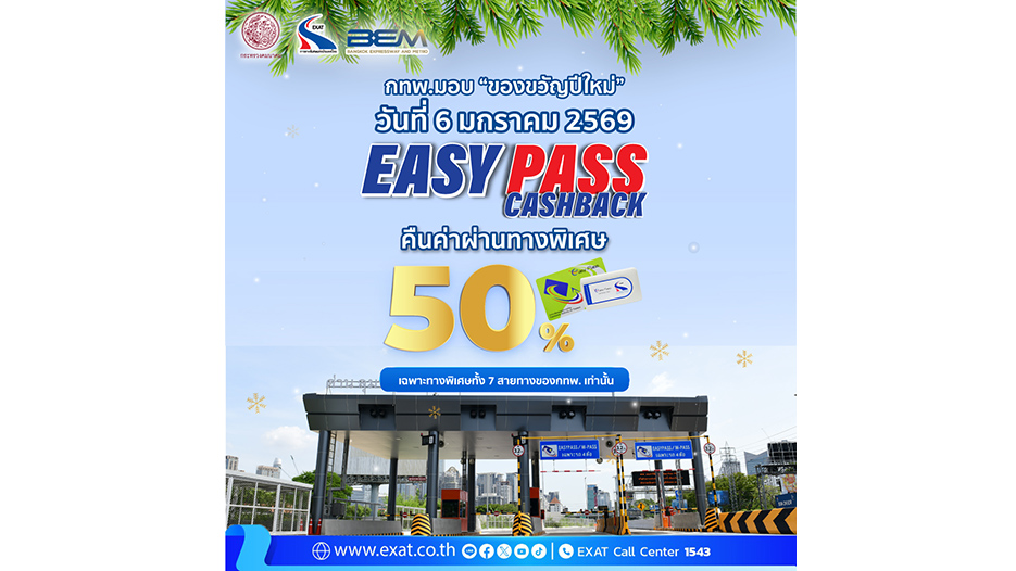 การทางพิเศษแห่งประเทศไทย (กทพ.) กระทรวงคมนาคม เตรียมมอบของขวัญต้อนรับปีใหม่ พิเศษสำหรับผู้ชำระค่าผ่านทางพิเศษด้วย EASY PASS กับแคมเปญพิเศษ EASY PASS…Cashback คืนค่าผ่านทาง 50% ในวันที่ 6 มกราคม 2569 ตั้งแต่เวลา 00.01-24.00 น. ครอบคลุมทางพิเศษทั้ง 7 สายทางของ กทพ. โดยระบบจะคืนเงินให้แบบ Real-Time และแจ้งเตือนการคืนค่าผ่านทางพิเศษ ผ่าน Application EXAT Portal สำหรับผู้ที่ผูกบัญชีไว้ หรือที่ thaieasypass.exat.co.th