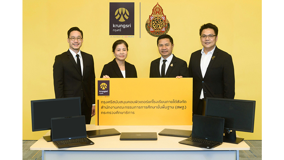 กรุงศรี (ธนาคารกรุงศรีอยุธยา จำกัด (มหาชน)) โดย นางสาวสายสุนีย์ หาญประเทืองศิลป์ (ที่ 2 จากซ้าย) ประธานกลุ่มสนับสนุนธุรกิจด้านเทคโนโลยีสารสนเทศและดิจิทัล และนายพชร วันรัตน์เศรษฐ (ซ้าย) ประธานคณะเจ้าหน้าที่ด้านเทคโนโลยีสารสนเทศ มอบคอมพิวเตอร์พร้อมอุปกรณ์จำนวน 1,300 เครื่อง ให้กับสำนักงานคณะกรรมการการศึกษาขั้นพื้นฐาน (สพฐ.) กระทรวงศึกษาธิการ ต่อเนื่องเป็นปีที่ 3 ตอกย้ำความมุ่งมั่นในการสร้างโอกาสทางการศึกษาอย่างเท่าเทียมและทั่วถึงไปยังพื้นที่ห่างไกล โดยมี นายพิเชฐร์ วันทอง (ที่ 2 จากขวา) รองเลขาธิการคณะกรรมการการศึกษาขั้นพื้นฐาน เป็นผู้แทนรับมอบ