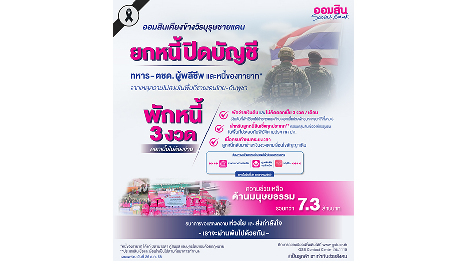 นางลภาวรรณ จันทร์กระจ่าง รองผู้อำนวยการธนาคารออมสิน รักษาการแทนผู้อำนวยการธนาคารออมสิน เปิดเผยว่า ธนาคารได้ประกาศ ยกหนี้ปิดบัญชีสินเชื่อเป็นกรณีพิเศษ สำหรับทหาร ตำรวจตระเวนชายแดน และกำลังพลหน่วยงานอื่นที่เสียชีวิตจากการปฏิบัติหน้าที่ ตั้งแต่วันที่ 7 ธันวาคม 2568 เป็นต้นมา โดยการยกหนี้ครอบคลุมถึงบัญชีสินเชื่อของทายาท 3 ลำดับ ได้แก่ บิดามารดา คู่สมรส และบุตรโดยชอบด้วยกฎหมาย พร้อมมอบเงินช่วยเหลือแก่ครอบครัวผู้เสียชีวิต รวมถึงกำลังพลและพลเรือนที่ได้รับบาดเจ็บ เพื่อเชิดชูเกียรติและเป็นขวัญกำลังใจแก่ผู้เสียสละ