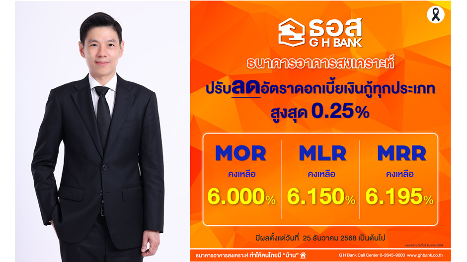 ดร.มหัทธนะ อัมพรพิสิฏฐ์ กรรมการผู้จัดการธนาคารอาคารสงเคราะห์ (ธอส.) เปิดเผยว่า ตามที่คณะกรรมการนโยบายการเงิน (กนง.) เมื่อวันที่ 17 ธันวาคม 2568 มีมติเป็นเอกฉันท์ให้ปรับลดอัตราดอกเบี้ยนโยบายลง 0.25% ต่อปี จาก 1.50% ต่อปี มาอยู่ที่ 1.25% ต่อปี โดยให้มีผลทันทีนั้น ธอส. ในฐานะสถาบันการเงินเฉพาะกิจของรัฐ จึงมีมติปรับลดอัตราดอกเบี้ยเงินกู้ลงทุกประเภทสูงสุด 0.25% ต่อปี เพื่อช่วยลดภาระดอกเบี้ยให้กับลูกค้า อีกทั้งยังช่วยกระตุ้นการตัดสินใจซื้อที่อยู่อาศัย และสร้างความเชื่อมั่นให้กับภาคอสังหาริมทรัพย์โดยรวม ประกอบด้วย อัตราดอกเบี้ยเงินกู้ลูกค้ารายย่อยชั้นดี (MRR) ลดลง 0.050% ต่อปี จาก 6.245% ต่อปี คงเหลือ 6.195% ต่อปี อัตราดอกเบี้ยเงินกู้ลูกค้ารายใหญ่ชั้นดี ประเภทเงินกู้แบบมีระยะเวลา (MLR) ลดลง 0.050% จาก 6.200% ต่อปี คงเหลือ 6.150% ต่อปี และอัตราดอกเบี้ยเงินกู้ลูกค้ารายใหญ่ชั้นดี ประเภทเงินเบิกเกินบัญชี (MOR) ลดลง 0.250% ต่อปี จาก 6.250% ต่อปี คงเหลือ 6.000% ต่อปี โดยให้มีผลตั้งแต่วันที่ 25 ธันวาคม 2568 เป็นต้นไป