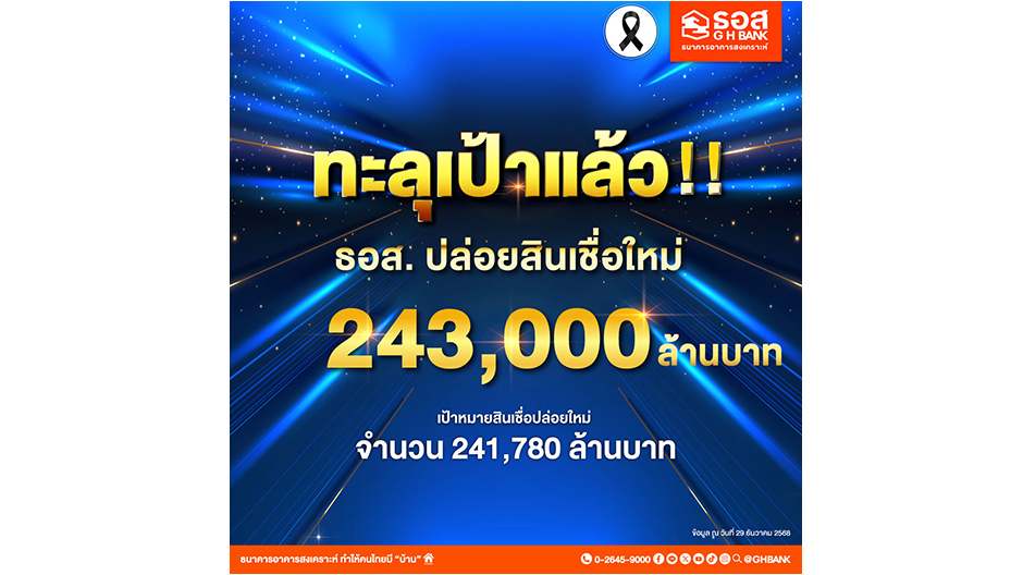 ทะลุเป้า! ธอส. ปล่อยสินเชื่อใหม่ปี 2568 จำนวนกว่า 243,000 ล้านบาท อัดฉีดเม็ดเงินกระตุ้นเศรษฐกิจผ่านภาคอสังหาริมทรัพย์