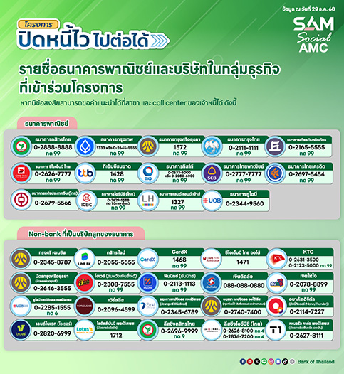 ผู้สนใจสามารถติดตามข่าวสาร หรือสอบถามข้อมูลรายละเอียดเพิ่มเติมได้ที่ SAM Contact Center 1443 กด 6 และ Line: @samsocialamc รวมถึงช่องทาง BOT Contact Center 1213 และสถาบันการเงินเจ้าหนี้เดิมของลูกหนี้