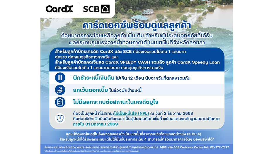 โดยลูกค้าสามารถติดต่อขอเข้าร่วมมาตรการ เพื่อยืนยันตัวตนว่าเป็นผู้ประสบภัยในพื้นที่ พร้อมแสดงหลักฐานความเสียหาย ภายใน 31 มกราคม 2569 ได้ที่ ศูนย์บริการลูกค้าคาร์ดเอกซ์ โทร.1468 หรือ SCB Customer Center โทร 02-777-7777