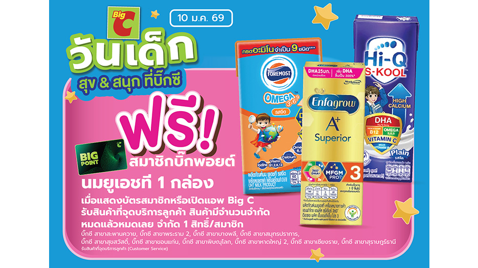 บิ๊กซี ซูเปอร์เซ็นเตอร์ ร่วมเฉลิมฉลองวันเด็กแห่งชาติ ปี 2569 ด้วยการจัดกิจกรรม “บิ๊กซี ฉลองวันเด็กแห่งชาติ” มอบนม UHT ฟรี 1 กล่องต่อคน (เฉพาะลูกค้าสมาชิกบิ๊กพอยต์) ให้เด็ก ๆ และครอบครัวที่มาจับจ่ายที่ บิ้กซี 10 สาขา ที่ร่วมรายการ ได้แก่ บิ๊กซี สาขาสะพานควาย, สาขาพระราม 2, สาขาบางพลี, สาขาสมุทรปราการ, สาขาสุขสวัสดิ์, สาขาขอนแก่น, สาขาพิษณุโลก, สาขาหาดใหญ่ 2, สาขาเชียงราย, สาขาสุราษฎร์ธานี  ในวันที่ 10 มกราคม 2569 หรือจนกว่าสินค้าจะหมด เพื่อร่วมสนับสนุนให้เด็ก ๆ ได้เริ่มต้นวันสำคัญด้วยโภชนาการที่ดีในราคาที่เข้าถึงได้ สะท้อนความตั้งใจของบิ๊กซีในการเป็นส่วนหนึ่งของชุมชน และสนับสนุนการดูแลสุขภาพของเด็กไทยอย่างยั่งยืน