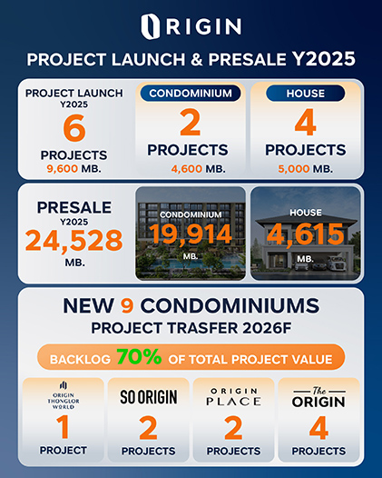 ออริจิ้น โชว์ยอดขายบ้าน-คอนโดฯ ปี 2568 กว่า 24,500 ล้านบาท ปี 2569 จ่อโอนคอนโดฯเพิ่มอีก 9 โครงการ ตุน Backlog แล้วกว่า 70% ของมูลค่าโครงการ