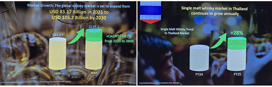 ตลาดวิสกี้โลกในปี 2568 มีมูลค่ากว่า 83.17 พันล้านดอลลาร์สหรัฐ และคาดว่าจะขยายตัวสู่ 105.2 พันล้านดอลลาร์สหรัฐในปี 2573 โดยซิงเกิลมอลต์เป็นเซกเมนต์ที่เติบโตสูงกว่าค่าเฉลี่ยตลาดอย่างต่อเนื่อง