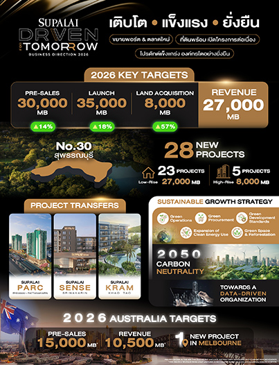 ท่ามกลางสภาพเศรษฐกิจที่ยังขยายตัวในกรอบจำกัด บริษัท ศุภาลัย จำกัด (มหาชน) ประกาศทิศทางธุรกิจปี 2569 ภายใต้แนวคิด “Driven for Tomorrow” เดินหน้าสร้างการเติบโตอย่างมั่นคง ควบคู่การพัฒนาอย่างยั่งยืน ตั้งเป้ายอดขายรวมทั้งในประเทศไทยและออสเตรเลีย 45,000 ล้านบาท พร้อมแผนเปิดโครงการใหม่ 28 โครงการ มูลค่ารวม 35,000 ล้านบาท ขยายทำเลใหม่ทั้งสุพรรณบุรีและเกาะสมุย เสริมสมดุลรายได้ด้วยตลาดต่างประเทศ โดยเฉพาะออสเตรเลียที่เติบโตโดดเด่นกว่า 370% ในปีที่ผ่านมา