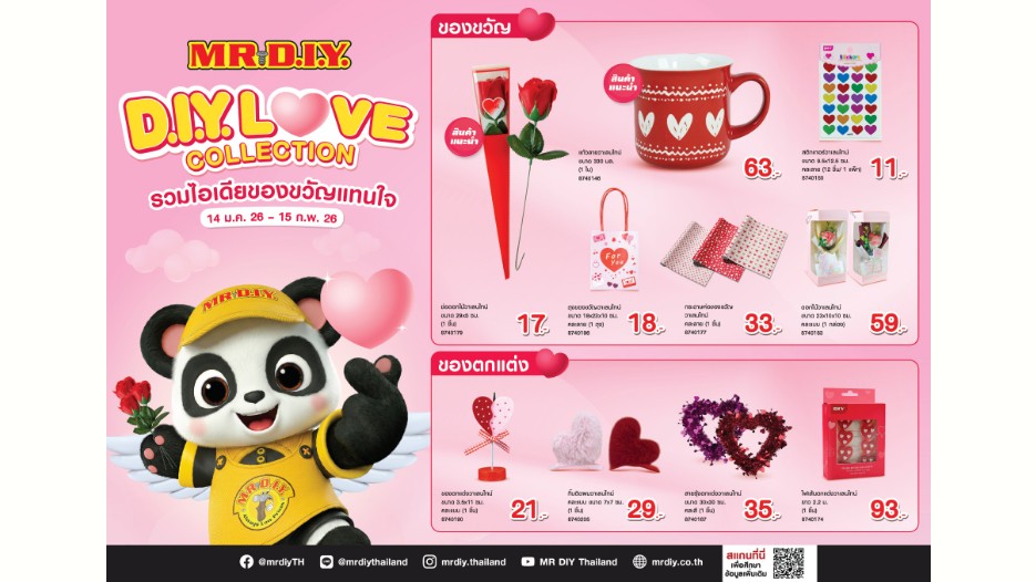 มิสเตอร์. ดี.ไอ.วาย. ผู้นำธุรกิจค้าปลีกอุปกรณ์ตกแต่งบ้านและสินค้าไลฟ์สไตล์ ต้อนรับเทศกาลแห่งความรัก ชวนทุกคนส่งต่อความรู้สึกดีๆ ผ่านสินค้า “D.I.Y. LOVE COLLECTION รวมไอเดียของขวัญแทนใจ”(1) ในวันวาเลนไทน์ คัดสรรของขวัญและของตกแต่งจำนวน 38 รายการ ในราคาถูกคุ้มเสมอ (Always Low Prices) เพื่อลูกค้าชาวไทยได้เลือกชอปเติมเต็มโมเมนต์พิเศษ ณ ร้านมิสเตอร์. ดี.ไอ.วาย. สาขาที่ร่วมรายการ(2) ตั้งแต่วันที่ 14 มกราคม 2569 ถึง 15 กุมภาพันธ์ 2569