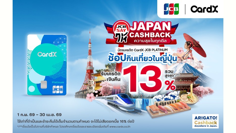 CardX ผู้ให้บริการบัตรเครดิตและสินเชื่อบุคคลภายใต้กลุ่มเอสซีบีเอกซ์ เดินหน้าตอกย้ำกลยุทธ์มอบความคุ้มค่าในการใช้จ่ายต่างประเทศ รับเทรนด์คนไทยเดินทางญี่ปุ่นพุ่งแรงอย่างต่อเนื่อง จับมือ JCB เปิดแคมเปญพิเศษ “JAPAN CASHBACK ให้ความสุขในทุกดีล” มอบสิทธิประโยชน์สุดคุ้มสำหรับลูกค้าบัตรเครดิต CardX JCB PLATINUM ชวนช้อป กิน เที่ยวทั่วญี่ปุ่น รับเครดิตเงินคืนรวมสูงสุด 13%*/** เมื่อใช้จ่ายเป็นสกุลเงินเยน ตอบโจทย์นักเดินทางที่ต้องการความคุ้มค่าในทุกการใช้จ่าย ตั้งแต่วันที่ 1 ก.พ. 69 – 30 เม.ย. 69
