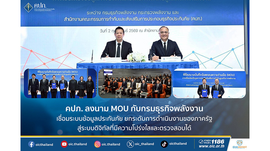 คปภ. ลงนาม MOU กับกรมธุรกิจพลังงาน เชื่อมระบบข้อมูลประกันภัย ยกระดับการดำเนินงานของภาครัฐสู่ระบบดิจิทัลที่มีความโปร่งใสและตรวจสอบได้