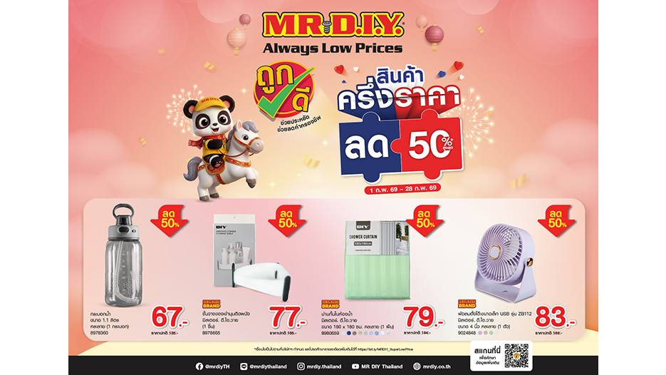 มิสเตอร์. ดี.ไอ.วาย. ผู้นำธุรกิจค้าปลีกอุปกรณ์ตกแต่งบ้านและสินค้าไลฟ์สไตล์ เดินหน้าช่วยประหยัด ออกโปรต่อเนื่อง นำ 4 สินค้ายอดนิยม ถูกดี(1) ลดครึ่งราคา 50% (สินค้ามีจำนวนจำกัด) เพิ่มความคุ้มค่าทุกการชอป เพื่อช่วยประหยัด ลดค่าครองชีพให้ลูกค้าทั่วประเทศไทย ณ ร้านมิสเตอร์. ดี.ไอ.วาย. สาขาที่ร่วมรายการ(2) ตลอดเดือนกุมภาพันธ์ 2569