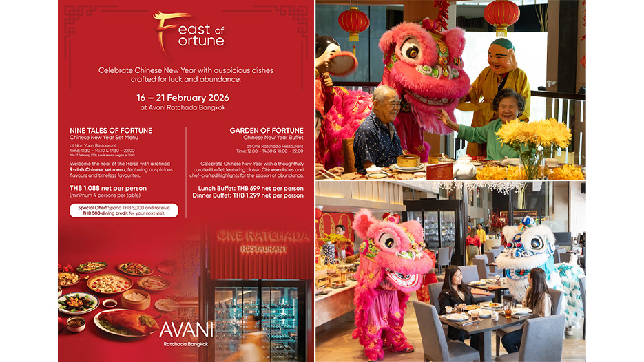 โรงแรมอวานี รัชดา กรุงเทพฯ (Avani Ratchada Bangkok) โรงแรมที่บริษัท ซี.พี. แลนด์ จำกัด (มหาชน) เป็นเจ้าของ และบริหารโดยเครือไมเนอร์ โฮเทลส์ ภายใต้แบรนด์อวานี ขอเชิญทุกท่านมาร่วมต้อนรับปีใหม่จีนกับ Feast of Fortune เฉลิมฉลองเทศกาลตรุษจีนผ่านประสบการณ์การรับประทานอาหารสุดพิเศษ ระหว่างวันที่ 16 – 21 กุมภาพันธ์ 2569 ตั้งแต่เมนูเซ็ตสุดประณีตไปจนถึงบุฟเฟ่ต์บรรยากาศอบอุ่น เพื่อให้ทุกการรวมตัวเต็มไปด้วยความหมาย ความสุข และการเริ่มต้นปีใหม่อย่างเป็นสิริมงคล