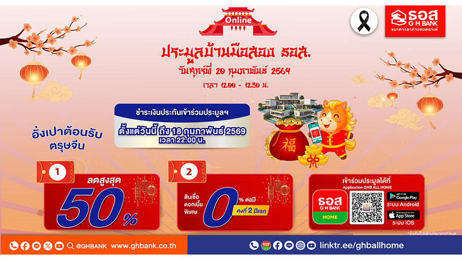 ธนาคารอาคารสงเคราะห์ (ธอส.) เดินหน้ากระตุ้นภาคอสังหาริมทรัพย์ และสนับสนุนประชาชนเข้าถึงที่อยู่อาศัยในราคาคุ้มค่า จัดประมูลบ้านมือสองออนไลน์ ธอส. ประจำปี 2569 ครั้งที่ 2 ในวันศุกร์ที่ 20 กุมภาพันธ์ 2569 ระหว่างเวลา 12.00 – 12.30 น. ผ่าน Application : GHB ALL HOME โดยนำทรัพย์คุณภาพดี ทำเลเด่นกว่า 1,000 รายการทั่วประเทศ ทั้งประเภทบ้านเดี่ยว บ้านแฝด ทาวน์เฮ้าส์ อาคารพาณิชย์ และที่ดินเปล่า ลดราคาสูงสุดถึง 50% จากราคาปกติ ผู้ที่สนใจสามารถดูทรัพย์จริงหรือรับชมภาพทรัพย์ก่อนเข้าร่วมประมูลได้ทาง Application : GHB ALL HOME หรือ www.ghbhomecenter.com และลงทะเบียนชำระเงินประกันเข้าร่วมประมูลออนไลน์ ได้ตั้งแต่วันนี้ ถึงวันที่ 18 กุมภาพันธ์ 2569 เวลา 22.00 น.