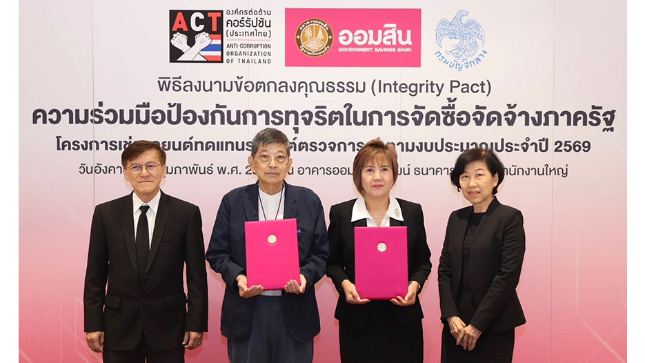 นางญดาภรณ์ ศรีพัฒน์ รองผู้อำนวยการธนาคารออมสิน กลุ่มปฏิบัติการ ลงนามบันทึกข้อตกลงคุณธรรม (Integrity Pact) กับคณะผู้สังเกตการณ์ตามข้อตกลงคุณธรรม องค์กรต่อต้านคอร์รัปชัน (ประเทศไทย) โดยมี กรมบัญชีกลาง เป็นสักขีพยาน ในความร่วมมือป้องกันการทุจริตในการจัดซื้อจัดจ้างภาครัฐ โครงการเช่ารถยนต์ทดแทนรถยนต์ตรวจการณ์ เพื่อใช้ในธุรกิจของธนาคารประจำสายงานกิจการสาขา และฝ่ายงานที่เกี่ยวข้อง ทดแทนสัญญาเช่าเดิมที่จะครบอายุสัญญา ซึ่งเป็นความร่วมมือป้องกันการทุจริตในการจัดซื้อจัดจ้างภาครัฐ ตามยุทธศาสตร์ในการป้องกันและปราบปรามการทุจริตคอร์รัปชันอย่างยั่งยืนของรัฐบาล ที่มีนโยบายส่งเสริมการบริหารงานที่มีธรรมาภิบาล และการป้องกันปราบปรามการทุจริตและประพฤติมิชอบในภาครัฐที่สร้างความไม่เป็นธรรมและเหลื่อมล้ำในสังคม สำหรับโครงการที่มีวงเงินจัดซื้อจัดจ้างตั้งแต่ 1,000 ล้านบาทขึ้นไป สอดคล้องกับการดำเนินการด้วยหลักธรรมาภิบาลของธนาคาร ที่ให้ความสำคัญในการบริหารจัดการงบประมาณ และทรัพยากรของธนาคาร ด้วยความรอบคอบ โปร่งใส และเกิดประโยชน์สูงสุด มีกระบวนการทำงานที่มีความสุจริต เที่ยงธรรม ตรวจสอบได้ในทุกขั้นตอน และเปิดโอกาสให้ภาคเอกชนเข้าแข่งขันอย่างเท่าเทียม โดยมี นายชาญเชพ ชินบานทอง ผู้ช่วยผู้อำนวยการธนาคารออมสิน สายงานบริหารงานกลาง กลุ่มปฎิบัติการ ร่วมเป็นสักขีพยาน ณ อาคารออมสินพิพัฒน์ ธนาคารออมสิน สำนักงานใหญ่ เมื่อวันที่ 17 กุมภาพันธ์ 2569