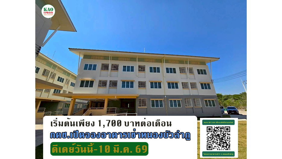การเคหะแห่งชาติ (กคช.) เชิญชวนประชาชนในจังหวัดหนองบัวลำภูและพื้นที่ใกล้เคียงที่กำลังมองหาที่อยู่อาศัยในราคาที่เหมาะสม เข้าร่วมโครงการอาคารเช่าพักอาศัย จังหวัดหนองบัวลำภู เริ่มเปิดให้ลงทะเบียนจองสิทธิแล้วตั้งแต่วันนี้ถึงวันที่ 10 มีนาคม 2569 ผ่านระบบออนไลน์หรือสแกน QR Code