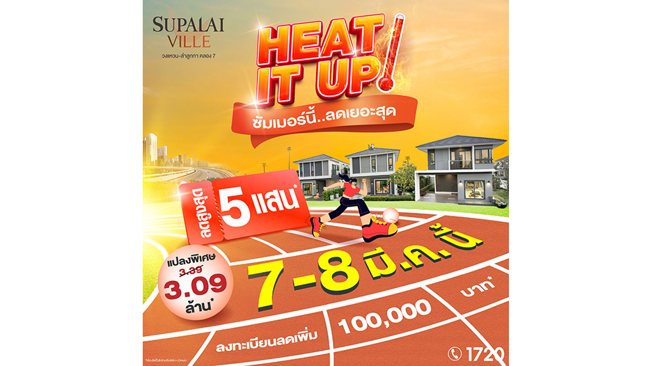 ศุภาลัย วิลล์ วงแหวน–ลำลูกกา คลอง 7 เปิดเกมรุกตลาดต้นปี ส่งแคมเปญ “HEAT IT UP ซัมเมอร์นี้ ลดเยอะสุด!” คัดบ้านเดี่ยว–บ้านแฝดแปลงพิเศษ ราคาพิเศษเริ่ม 3.09 ล้านบาท* พร้อมเข้าอยู่ทันที บนทำเลศักยภาพโซนวงแหวน–ลำลูกกา จัดเต็มเฉพาะ 7–8 มีนาคมนี้ หวังเร่งการตัดสินใจกลุ่มครอบครัวที่มองหาบ้านคุ้มค่า พร้อมโปรโมชันจำกัดเวลา