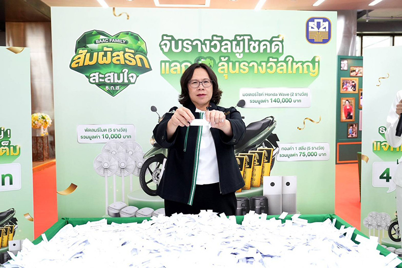 นางสาวพรหมกร พรหมขัติแก้ว ผู้ช่วยผู้จัดการธนาคารเพื่อการเกษตรและสหกรณ์การเกษตร (ธ.ก.ส.) เป็นประธานในการจับรางวัล “BAAC Family สัมผัสรัก สะสมใจ ธ.ก.ส.” บน LINE Official BAAC Family ให้แก่ลูกค้า ธ.ก.ส. สมาชิก Line BAAC Family ที่สมัครเข้าร่วมกิจกรรมสะสม “ใจ” และทำตามภารกิจต่าง ๆ ซึ่งเปิดให้เข้าร่วมกิจกรรม ตั้งแต่วันที่ 17 มิถุนายน 2568 – 17 กุมภาพันธ์ 2569 ที่ผ่านมา โดย “ใจ” ที่สะสมสามารถนำไปแลกรับของรางวัลรายเดือน หรือใช้แลกเป็นสิทธิ์ลุ้นรางวัลใหญ่เมื่อจบแคมเปญ รวมมูลค่ากว่า 4 แสนบาท อาทิ มอเตอร์ไซค์ Honda Wave ทองคำ 1 สลึง เครื่องฟอกอากาศ หม้อหุงข้าว หม้อทอดไร้น้ำมัน และพัดลมรีโมต โดย ธ.ก.ส. จะมีการประกาศรายชื่อผู้โชคดีทาง LINE Official Account BAAC Family (@baacfamily) และ Facebook : ธกส BAAC Thailand ในวันที่ 2 มีนาคม 2569 และจัดส่งของรางวัลให้กับผู้โชคดีต่อไป (เงื่อนไขอื่น ๆ เป็นไปตามที่ธนาคารกำหนด)