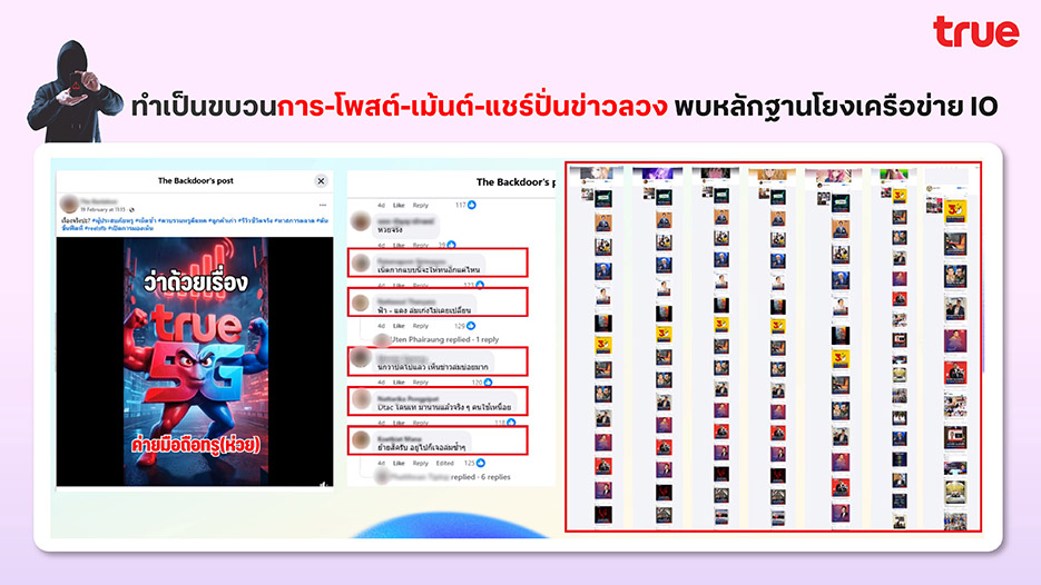 จากการตรวจสอบ บริษัท ฯ พบพฤติกรรมเผยแพร่เนื้อหาในรูปแบบและประเด็นเดียวกันผ่านหลายบัญชีโซเชียลมีเดียในช่วงเวลาเป็นระบบทุกวันต่อเนื่อง จึงน่าเชื่อว่าเป็นการดำเนินการอย่างเป็นขบวนการ บริษัท ฯ จึงได้รวบรวมพยานหลักฐานเชิงเทคนิคและข้อมูลที่ได้จากการตรวจสอบทั้งหมดซึ่งในเบื้องต้นพบว่ามีทั้งที่เป็นบุคคลธรรมดาและบริษัทผลิตสื่อที่มีเครือข่ายหรือองค์กรที่อยู่เบื้องหลังซึ่งจะนำส่งมอบให้แก่เจ้าหน้าที่ตำรวจใช้ประกอบการสืบสวน ขยายผล และติดตามผู้ที่กระทำความผิดรวมทั้งผู้ที่เกี่ยวข้องให้ต้องรับผิดตามโทษที่กฎหมายกำหนดไว้สูงสุดต่อไป