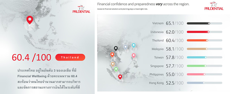 งานวิจัยนี้เป็นฐานข้อมูลสำคัญที่แสดง ดัชนีชี้วัดความเป็นอยู่ที่ดีทางการเงิน (Financial Wellbeing Index) ฉบับแรกของกลุ่มบริษัทพรูเด็นเชียล ครอบคลุมประชากรกว่า 7,000 คนในภูมิภาคเอเชีย ที่มีอายุระหว่าง 18-60 ปี ใน 8 ตลาดหลัก ได้แก่ ฮ่องกง อินโดนีเซีย มาเลเซีย ฟิลิปปินส์ สิงคโปร์ ไต้หวัน เวียดนาม รวมทั้ง ไทย ผลการศึกษาชี้ให้เห็นว่า ทั่วทั้งภูมิภาคเอเชียยังมีช่องว่างที่ชัดเจนระหว่างความมั่นคงทางการเงินปัจจุบัน กับความพร้อมทางการเงินในอนาคต สะท้อนว่าความมั่นใจในวันนี้ ไม่ได้หมายความว่าจะพร้อมรับมือกับอนาคตเสมอไป