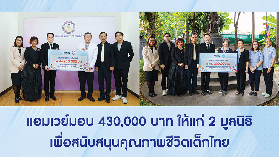 บริษัท แอมเวย์ (ประเทศไทย) จำกัด โดย นายทศพร นิษฐานนท์ กรรมการผู้จัดการ พร้อมตัวแทนคณะกรรมการกิจกรรมเพื่อสังคม ผสานต่อพลังแห่งการให้อย่างไม่หยุดนิ่ง ร่วมสนับสนุนการพัฒนาคุณภาพชีวิตและมอบโอกาสให้เด็ก ๆ ได้เติบโตแข็งแรงและเป็นกำลังสำคัญของประเทศในอนาคต โดยร่วมมอบเงินสนับสนุนแก่องค์กรที่ทำงานเพื่อเด็กและสังคม จำนวน 430,000 บาท ได้แก่
