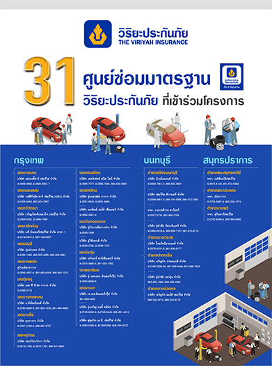 สำหรับศูนย์ซ่อมมาตรฐานวิริยะประกันภัยที่เข้าร่วมโครงการให้บริการตรวจรถฟรี จำนวน 31 แห่ง ได้แก่ 1) อู่ร่วมมิตรการาจ 2) บจ.นิวเพื่อนยนต์ 3) บจ.ไทยรัตน์ยานยนต์ 4) หจก. งามวงศ์วาน คาร์แคร์ 5) บจ.อู่นำชัย รัตนาธิเบศร์ 6) บจ.เซอร์กิต ติวานนท์ 7) บจ.อู่นำชัย เตาปูน (สาขาติวานนท์) 8) บจ.เจริญกิจ ราชพฤกษ์ 9) บจ.เจริญกิจ ออโต้ เซอร์วิส 10) บจ. คุงการาจ 11) บจ.เซอร์กิตบริการ 12) บจ.อู่กังวานชัยการช่าง 13) บจ.อู่วิชัยยนต์ 14) บจ.เทวินทร์ คาร์เซ็นเตอร์ 15) อู่บอส 888 การาจ 16) บจ.ธนพัฒน์ ออโต้ เซ็นเตอร์ 17) บจ.เพอร์เฟคท์ สปีด ไลน์ 18) บจ.เอส ซี ซี 65 การาจ 19) หจก. เจดีย์ออโต้เซอร์วิส 20) หจก.เป้งการาจ 21) บจ. อู่ เอส.เอส. อินเตอร์กรุ๊ป 22) บจ.รุ่งเจริญ บอดี้ คลีนิค 23) บจ.สุขุมวิท เอ.ที. เซอร์วิส 24) หจก.สุทินคาร์เซอร์วิส 25) บจ.เฮงบอดี้คาร์ เซอร์วิส 26) บจ.เฮงบอดี้คาร์ เซอร์วิส 27) บจ.วงษ์ศิริเลิศ คาร์ เซอร์วิส (1997) 28) บจ.เจริญภัณฑ์ยนตรกิจ เซอร์วิส 29) บจ.นที อินเตอร์เซอร์วิส สาขา 1 30) บจ.อู่แม่กลอง 31) บจ.อ.พิพัฒน์ยนต์ (1989)