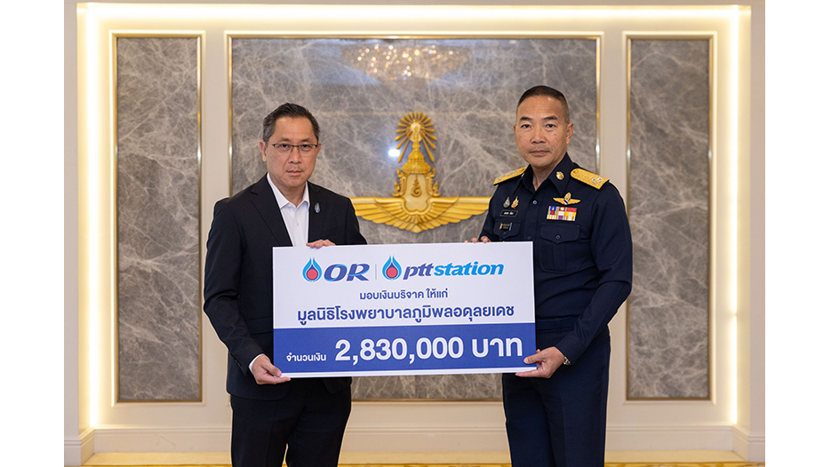 หม่อมหลวงปีกทอง ทองใหญ่ ประธานเจ้าหน้าที่บริหาร พร้อมด้วย คุณไพศาล อุดมกุลวณิชย์ รองประธานเจ้าหน้าที่บริหารด้านธุรกิจเอนเนอร์ยี่โซลูชัน บริษัท ปตท. น้ำมันและการค้าปลีก จำกัด (มหาชน) (OR) และผู้แทนจาก พีทีที สเตชั่น ร่วมมอบเงินสนับสนุนจำนวน 2,830,000 บาท ให้แก่ พลอากาศเอก เสกสรร คันธา ผู้บัญชาการทหารอากาศ เพื่อนำไปใช้ในการจัดซื้อเครื่องมือแพทย์สำหรับการรักษาผู้ป่วยด้านอายุรกรรม มูลนิธิโรงพยาบาลภูมิพลอดุลยเดช ซึ่งเป็นโรงพยาบาลภายใต้สังกัดกรมแพทย์ทหารอากาศ รวมถึงใช้เป็นเครื่องมือสนับสนุนการเรียนการสอน สำหรับนิสิตแพทย์ แพทย์ประจำบ้าน และแพทย์ประจำบ้านต่อยอด เพื่อเสริมศักยภาพการให้บริการทางการแพทย์ และการพัฒนาบุคลากรด้านสาธารณสุขของประเทศ